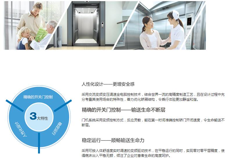病床电梯是秉承”以人为本“的设计理念、专为医院等特殊场合需求而设计的一款产品,其温馨舒适的轿厢修,平稳舒 适的乘梯体验,融合了医院特殊要求的各项选 配功能,最大化满足了医院及患者的需求。